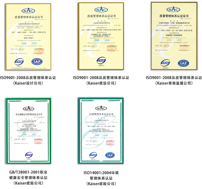 凱杰公司發(fā)揮中國當?shù)仄髽I(yè)的優(yōu)勢,擁有外資建筑企業(yè)很難單獨取得的建設(shè)工程資質(zhì)。 并且Kaiser引進了國際標準的【ISO9001】質(zhì)量保證體系,構(gòu)筑【Kaiser獨有的質(zhì)量管理體制】、達到【員工質(zhì)量意識提高】【業(yè)界動態(tài)把握】【產(chǎn)品和服務(wù)魅力提高】的目標。